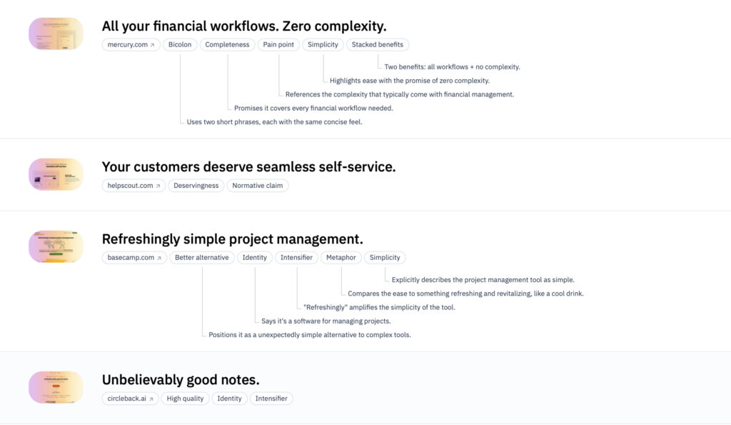 A websiteheadlines.com egy remek gyűjteményt állított össze különböző weboldalak hero szekcióiból, ami remek tanulmányi anyagként szolgál számunkra. Ha megnézed ezt az oldalt, rögtön szembetűnik, mennyire különböző megközelítéseket alkalmaznak a brandek. Sőt ennél több is: elemzi az egyes szavakat, hogy mi miért működik – zseniális.✨