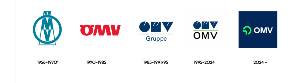 Visszapillantás: 1985-ben a vállalat egy kék logót vezetett be. A fokozatos nemzetközivé válás során 1995-ben a geometriai alapformákból álló, néha nehezen megfejthető logó kiegészült egy semleges betűtípusú „OMV” emblémával.