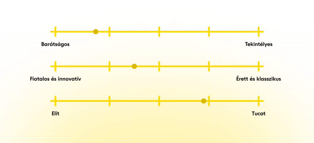 Nem tűnik túl bonyolult feladatnak, mégis fontos, hogy spektrumok tengelyén megfelelő pontra helyezzük el brandünket, és az is sokat kifejez, ha valamely szempontból középre kerül a csúszka. Ez a néhány, meghatározott hangsúly fejezi ki a brandünk személyiségét. Kihat a későbbi kommunikáció hangjára, nyelvezetére, a vizuális megjelenésre.