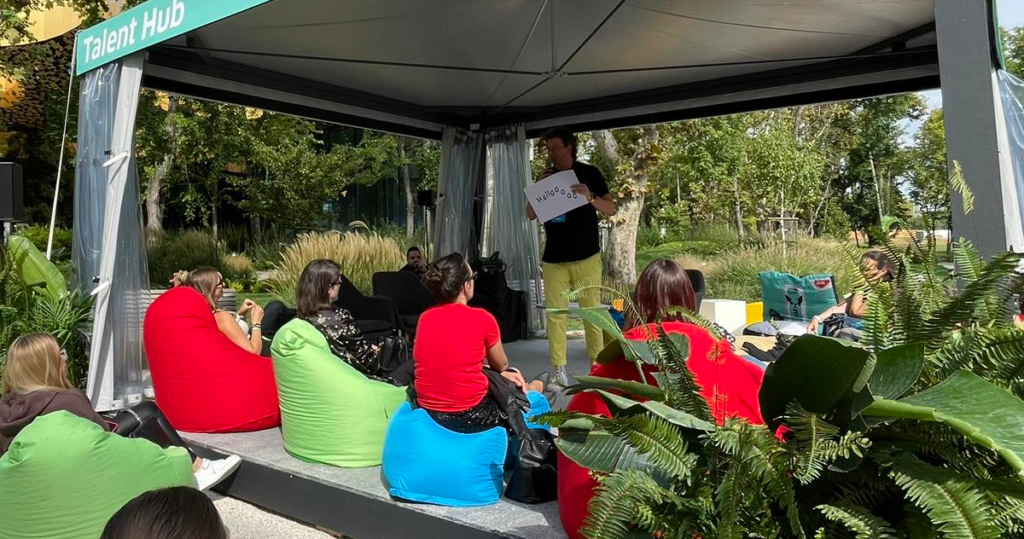 A színpad vagy inkább sátor, amelyben a workshopom volt a Talent Hub nevet viselte és laza, kötetlen hangulata volt, hiszen nem voltak oldalfalai és a közönség babzsákokon foglalhatott helyet a workshop alatt. Szerencsére kora délutánra már hétágra sütött a nap, nem volt akadálya a workshopnak.