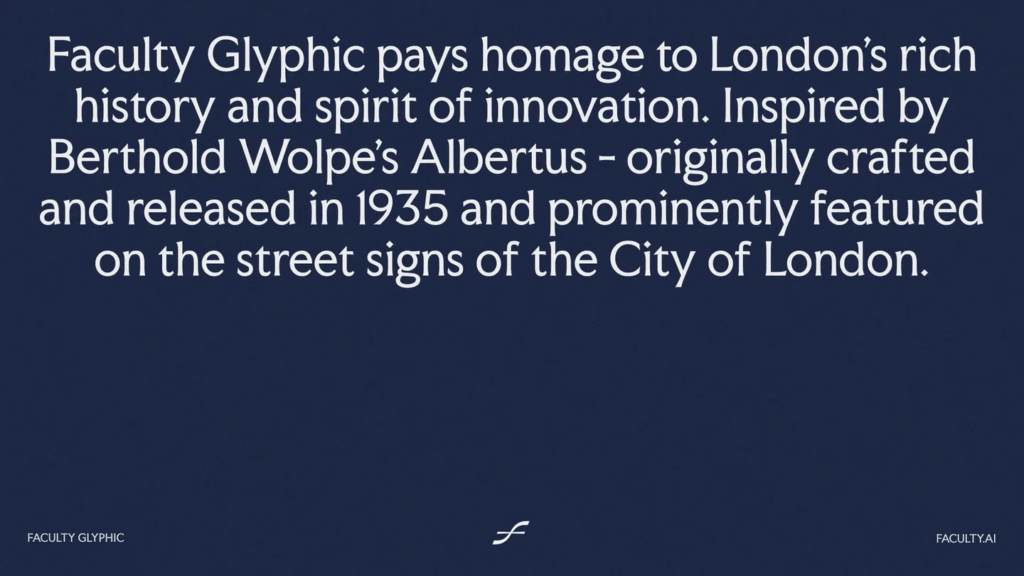 A Koto kreatív stúdió munkája a Faculty londoni AI-vállalat számára szemléletes példa: a márkaidentitás szinte kizárólag egyedi betűtípusra épül (Faculty Glyphic, egy Albertus ihletésű talpas betű), amely néhány ismétlődő kompozíciós struktúrával és jellegzetes színátmenettel kiegészülve a szervezet fókuszát és küldetését leíró mondatok megjelenítésére szolgál.