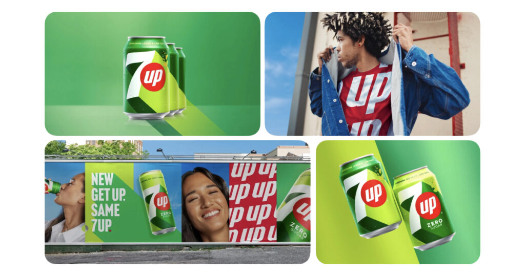 A 7up egy dinamikusabb arculatra és csomagolásra váltott, a brand “uplifting”, tehát felemelő ambícióit megcélozva, utalva a márkanév “up” részére. Ezt a szinte repülő hatást a zöld árnyalatainak kombinálásával hozták létre.