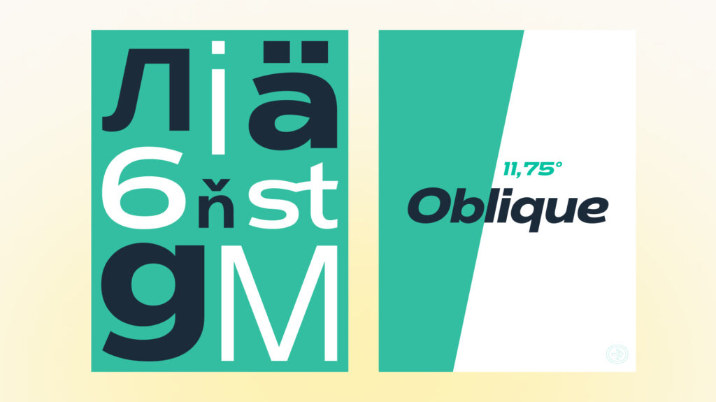 A karakterkészlet összesen mintegy 560 elemet tartalmaz, beleértve a latin és cirill betűket, az írásjeleket, a ligatúrákat és az alternatív karaktereket. A teljes készletből öt vastagsági változat készült – Light, Regular, Medium, SemiBold és Bold –, valamint mindegyikhez dőlt (Oblique) verzió is. Emellett létrehoztunk egy Italic Export változatot is, ahol bizonyos karakterek formailag eltérnek az Oblique verziótól, így még gazdagabb tipográfiai eszköztárat biztosítanak.