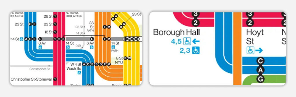 - Egyszerűsített dizájn, amely a Vignelli térképre emlékeztet ugyan, de modern elemekkel ötvözi azt.